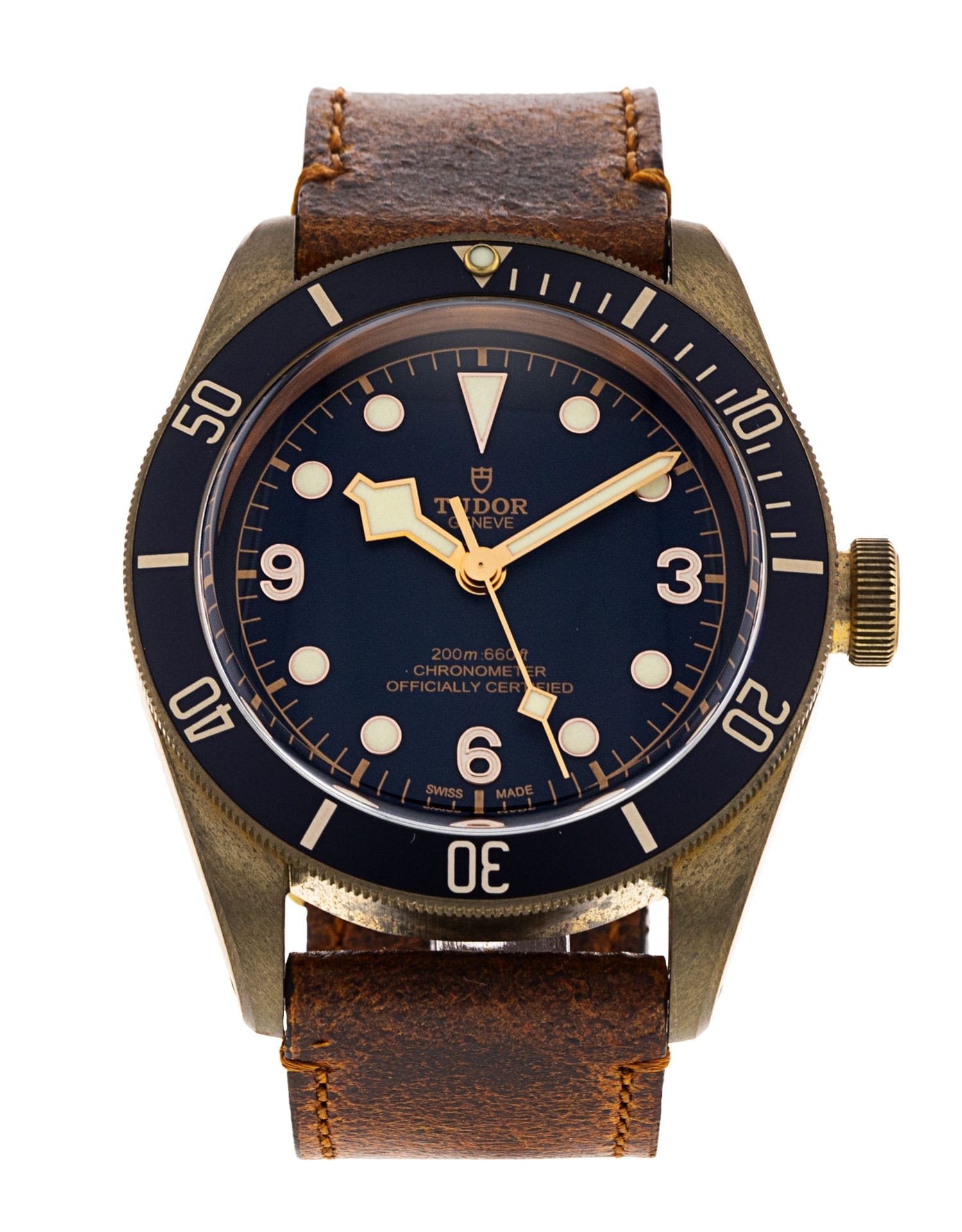 This Tudor Heritage Black Bay 79250BB has a blue quarter arabic dial and a leather strap. This Tudor has undergone a thorough inspection of water resistance, accuracy, functionality and condition to determine the level of reconditioning required to meet our strict standards. It has also been referenced against technical documents and manufacturer records where available to ensure authenticity and a clean history. Our watches have a 24-month warranty for your peace of mind, in conjunction with any remaining manufacturer’s warranty from new or from service. To maintain the manufacturer’s warranty on this watch, it has not been polished in our service centre.