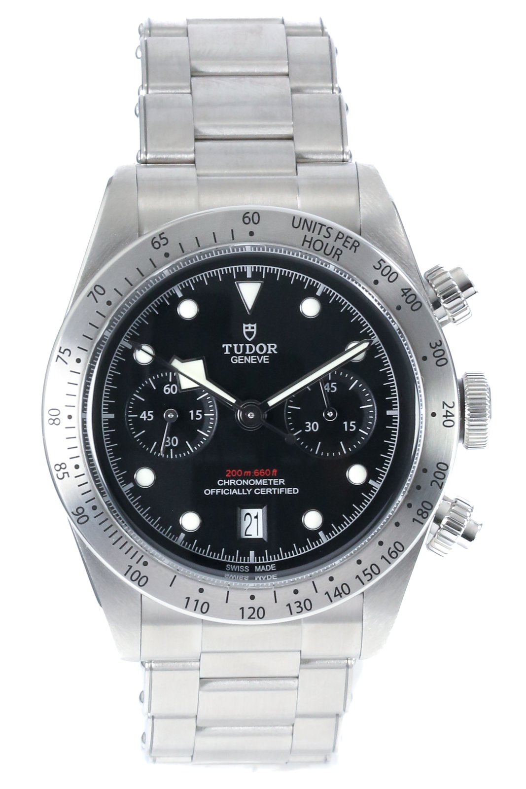 This Tudor Heritage Black Bay M79350-0004 has a black dial and a bracelet strap. This Tudor has undergone a thorough inspection of water resistance, accuracy, functionality and condition to determine the level of reconditioning required to meet our strict standards. It has also been referenced against technical documents and manufacturer records where available to ensure authenticity and a clean history. Our watches have a 24-month warranty for your peace of mind, in conjunction with any remaining manufacturer’s warranty from new or from service. To maintain the manufacturer’s warranty on this watch, it has not been polished in our service centre.