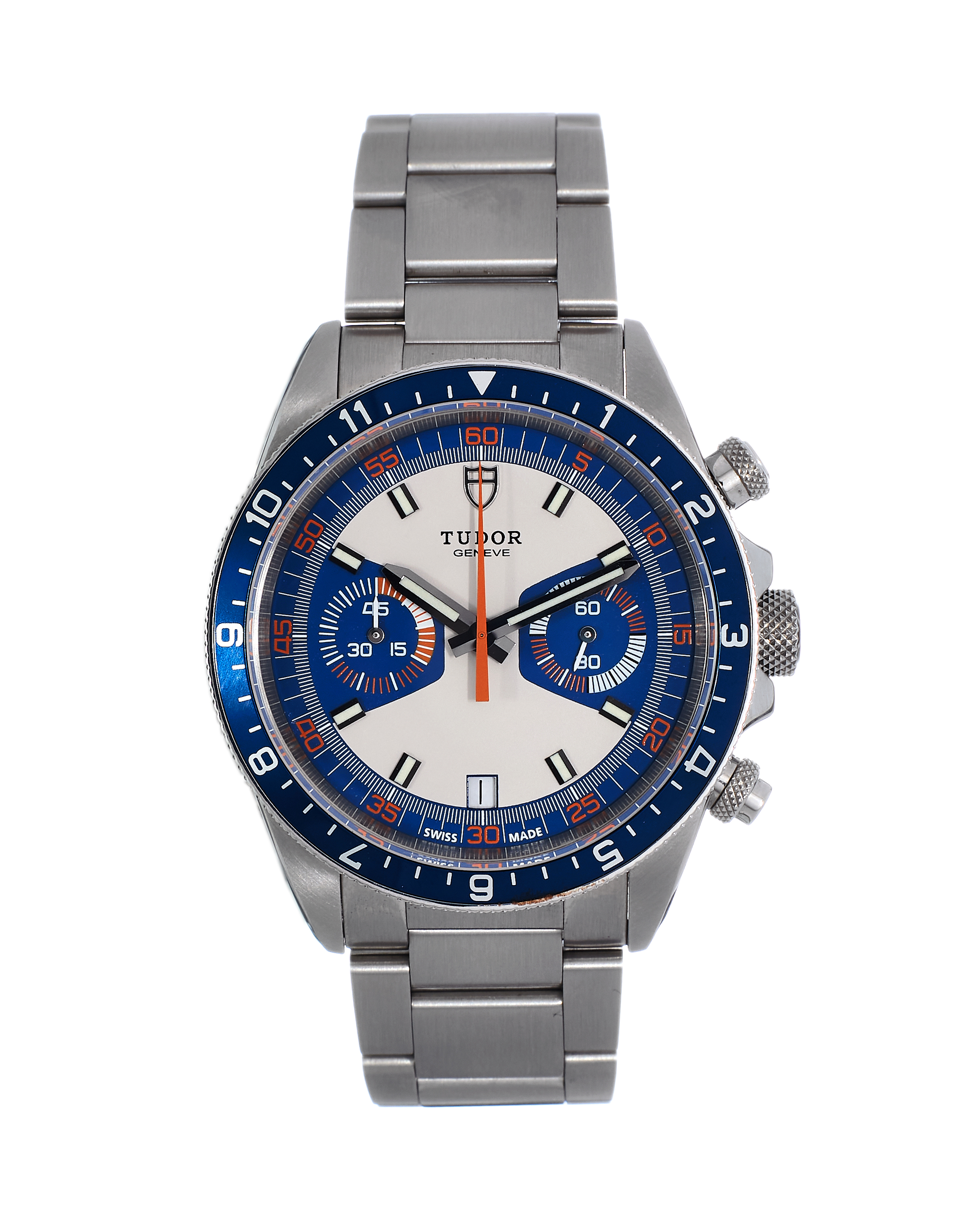 This Tudor Heritage Chronograph M70330B-0004 has a blue dial and a bracelet strap. This Tudor has undergone a thorough inspection of water resistance, accuracy, functionality and condition to determine the level of reconditioning required to meet our strict standards. It has also been referenced against technical documents and manufacturer records where available to ensure authenticity and a clean history. All our watches have a 24-month warranty for your peace of mind. One of our skilled polishing technicians has removed marks on the case and bracelet of this watch, brought about by daily wear and tear, which is why this watch does not come with the remaining manufacturer’s warranty.