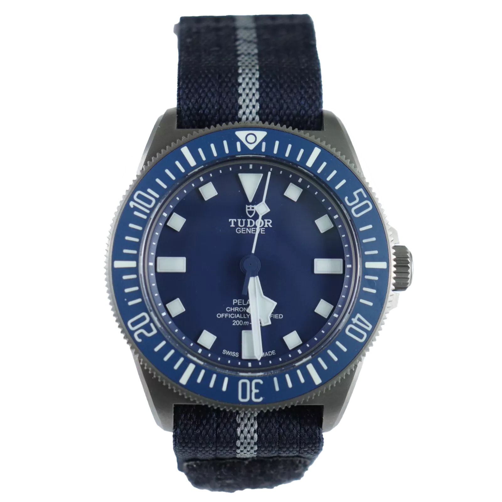 This Tudor Pelagos FXD M25707B/23-0001 has a blue dial and a fabric strap. This Tudor has undergone a thorough inspection of water resistance, accuracy, functionality and condition to determine the level of reconditioning required to meet our strict standards. It has also been referenced against technical documents and manufacturer records where available to ensure authenticity and a clean history. All our watches have a 24-month warranty for your peace of mind. One of our skilled polishing technicians has removed marks on the case and bracelet of this watch, brought about by daily wear and tear, which is why this watch does not come with the remaining manufacturer’s warranty.