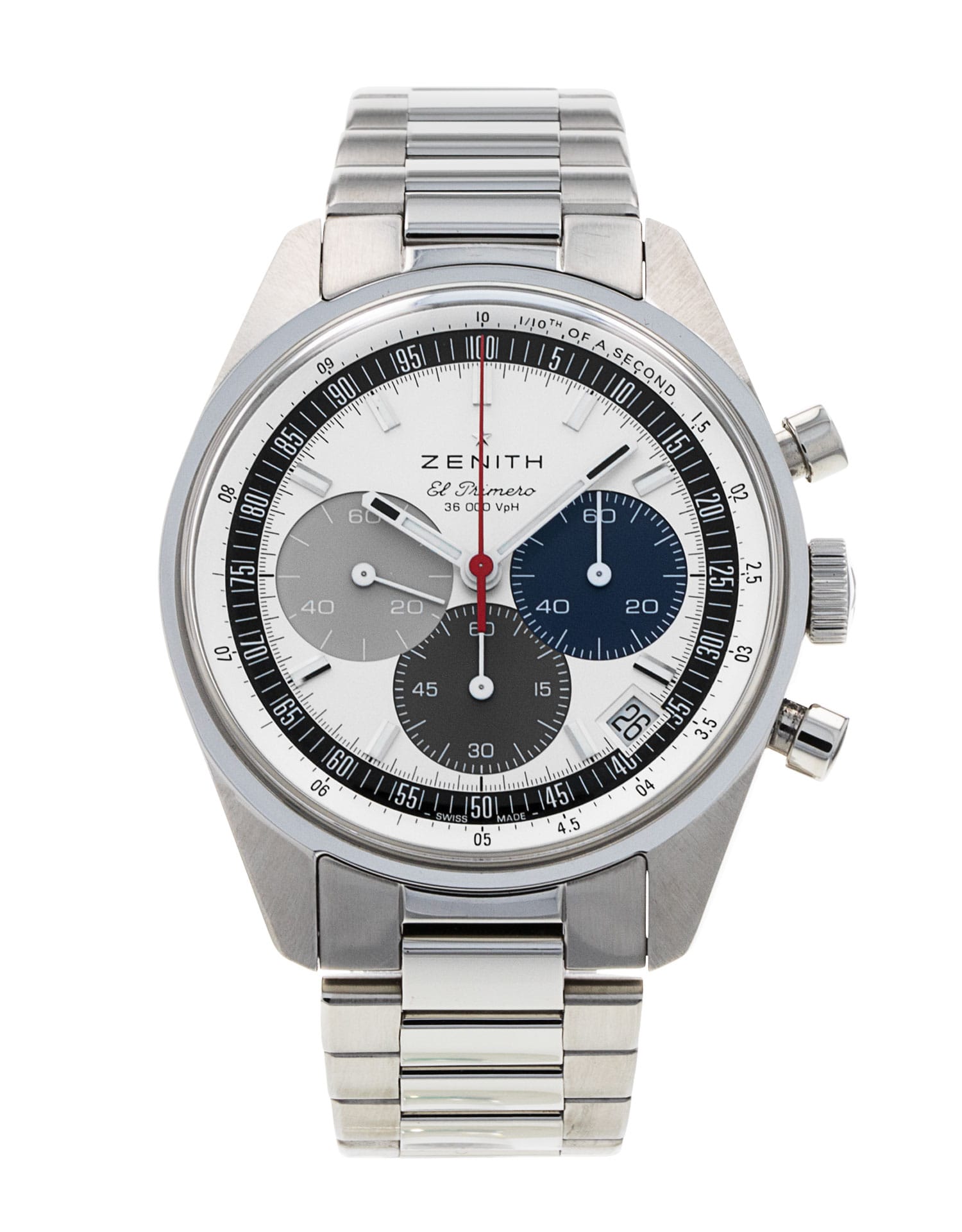 This Zenith Chronomaster 03.3200.3600/69.M3200 has a white dial and a bracelet strap. This Zenith has undergone a thorough inspection of water resistance, accuracy, functionality and condition to determine the level of reconditioning required to meet our strict standards. It has also been referenced against technical documents and manufacturer records where available to ensure authenticity and a clean history. All our watches have a 24-month warranty for your peace of mind.