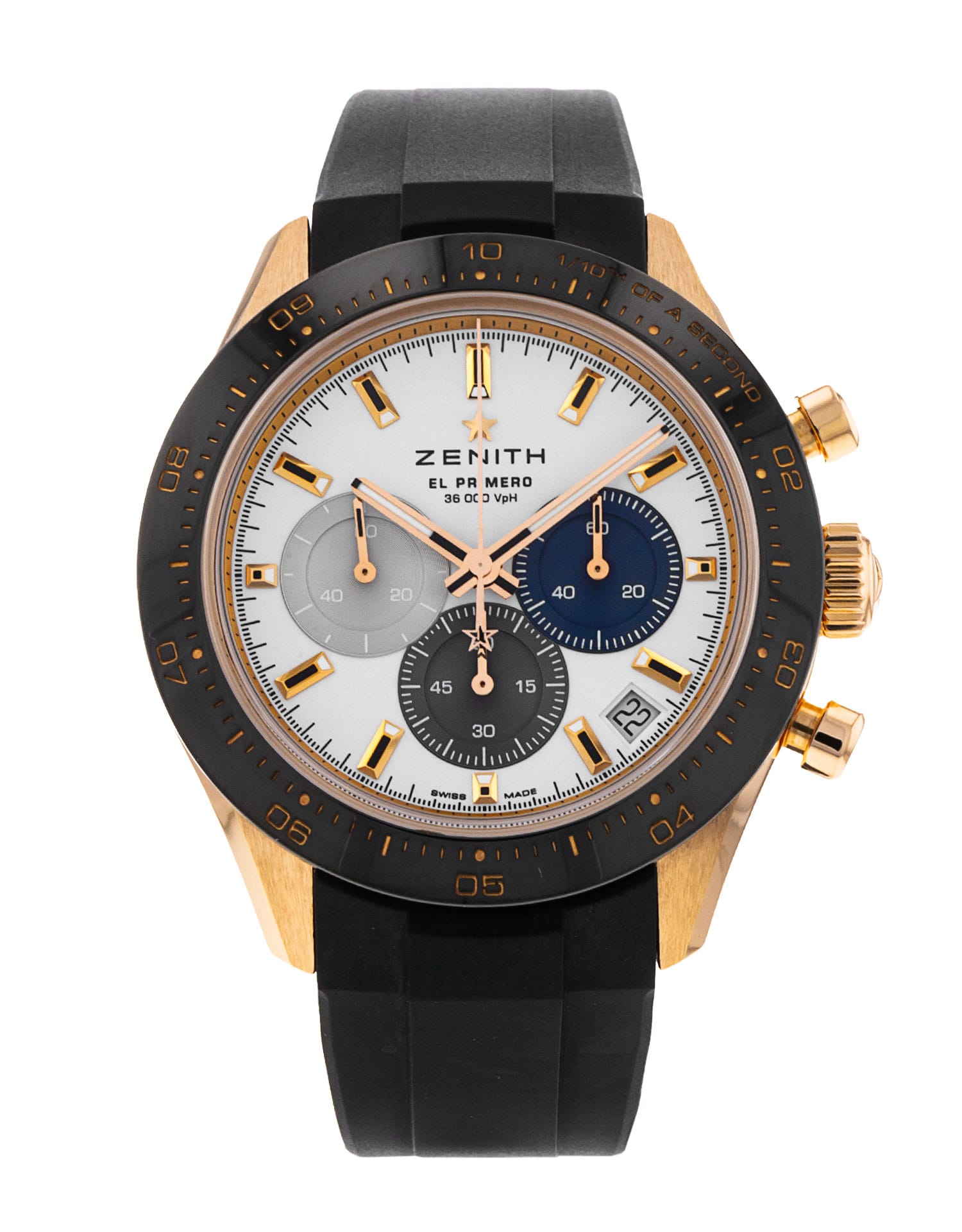 This Zenith Chronomaster 18.3100.3600/69.C920 has a white baton dial and a rubber strap. This Zenith has undergone a thorough inspection of water resistance, accuracy, functionality and condition to determine the level of reconditioning required to meet our strict standards. It has also been referenced against technical documents and manufacturer records where available to ensure authenticity and a clean history. All our watches have a 24-month warranty for your peace of mind.