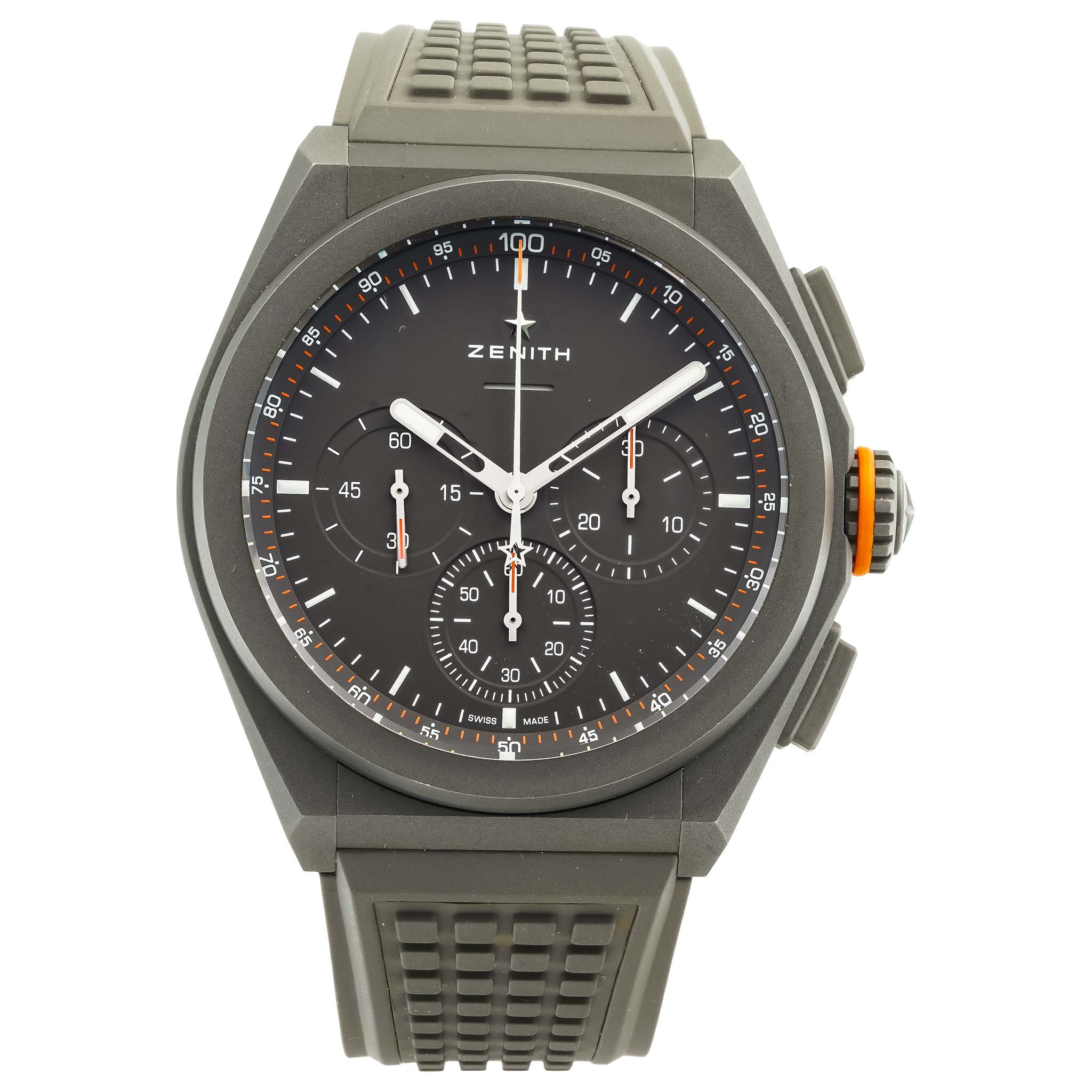 This Zenith Defy 97.9000.9004/01.R787 has a grey dial and a rubber strap. This Zenith has undergone a thorough inspection of water resistance, accuracy, functionality and condition to determine the level of reconditioning required to meet our strict standards. It has also been referenced against technical documents and manufacturer records where available to ensure authenticity and a clean history. All our watches have a 24-month warranty for your peace of mind.