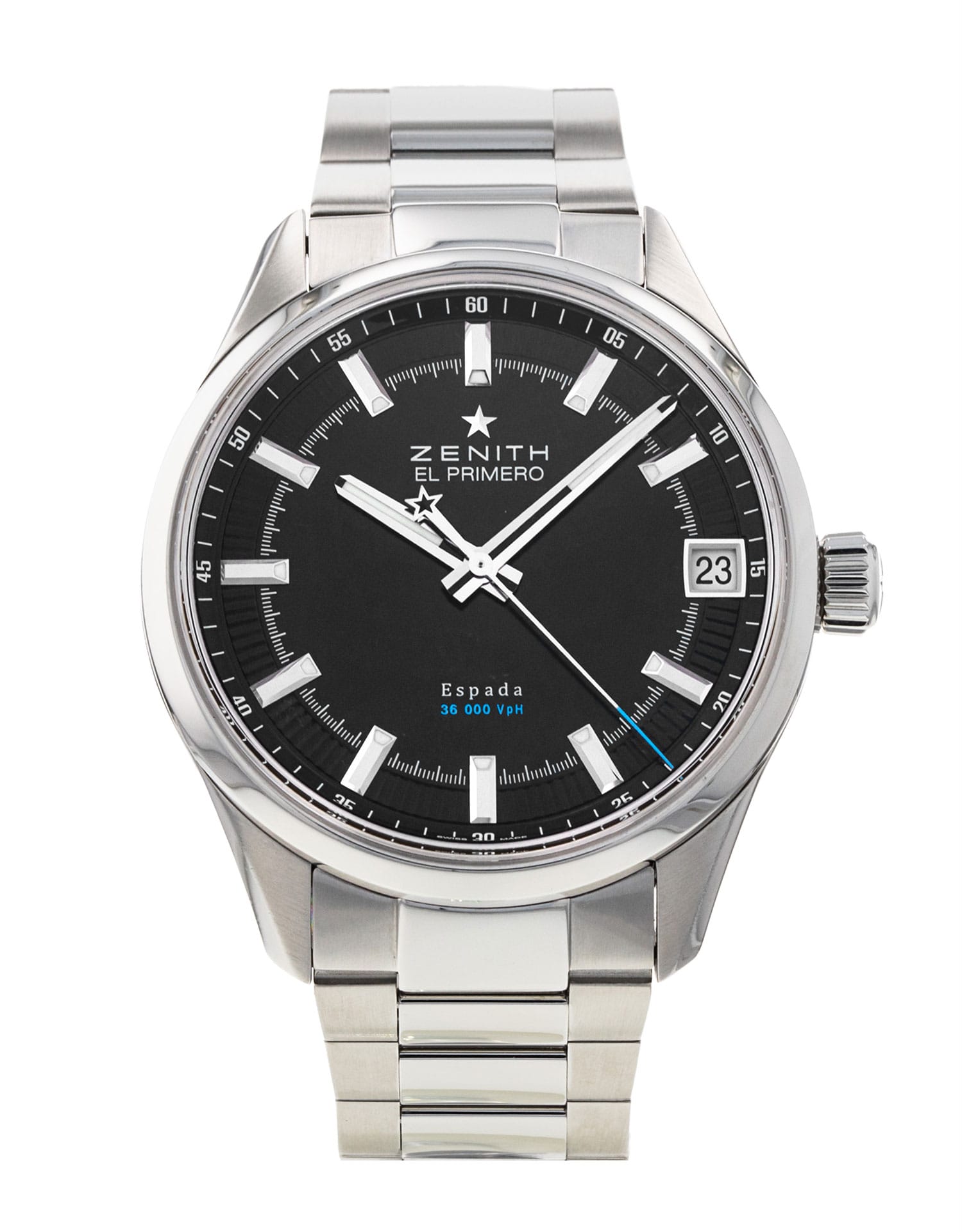 This Zenith El Primero 03.2170.4650/21.M2170 has a black baton dial and a bracelet strap. This Zenith has undergone a thorough inspection of water resistance, accuracy, functionality and condition to determine the level of reconditioning required to meet our strict standards. It has also been referenced against technical documents and manufacturer records where available to ensure authenticity and a clean history. All our watches have a 24-month warranty for your peace of mind.