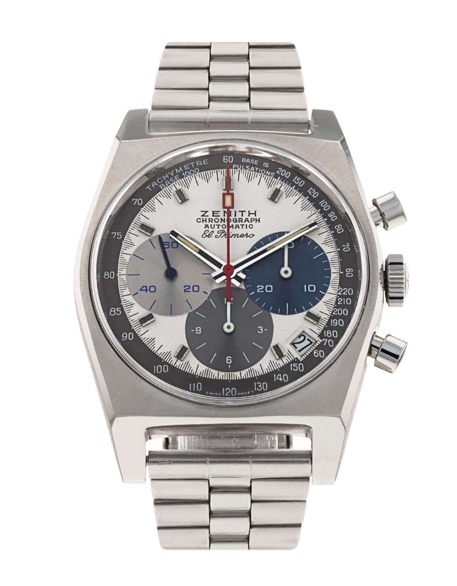 This Zenith El Primero 03.A384.400/3817.M3817 has a silver dial and a bracelet strap. Due to age, this Zenith may not fall within our typical expected tolerances for timekeeping, and is no longer suitable for use in wet environments or submersion in water. In the interests of preserving original features, utmost care has been taken to sympathetically restore this watch. It has also been referenced against technical documents and manufacturer records where available to ensure authenticity and a clean history.