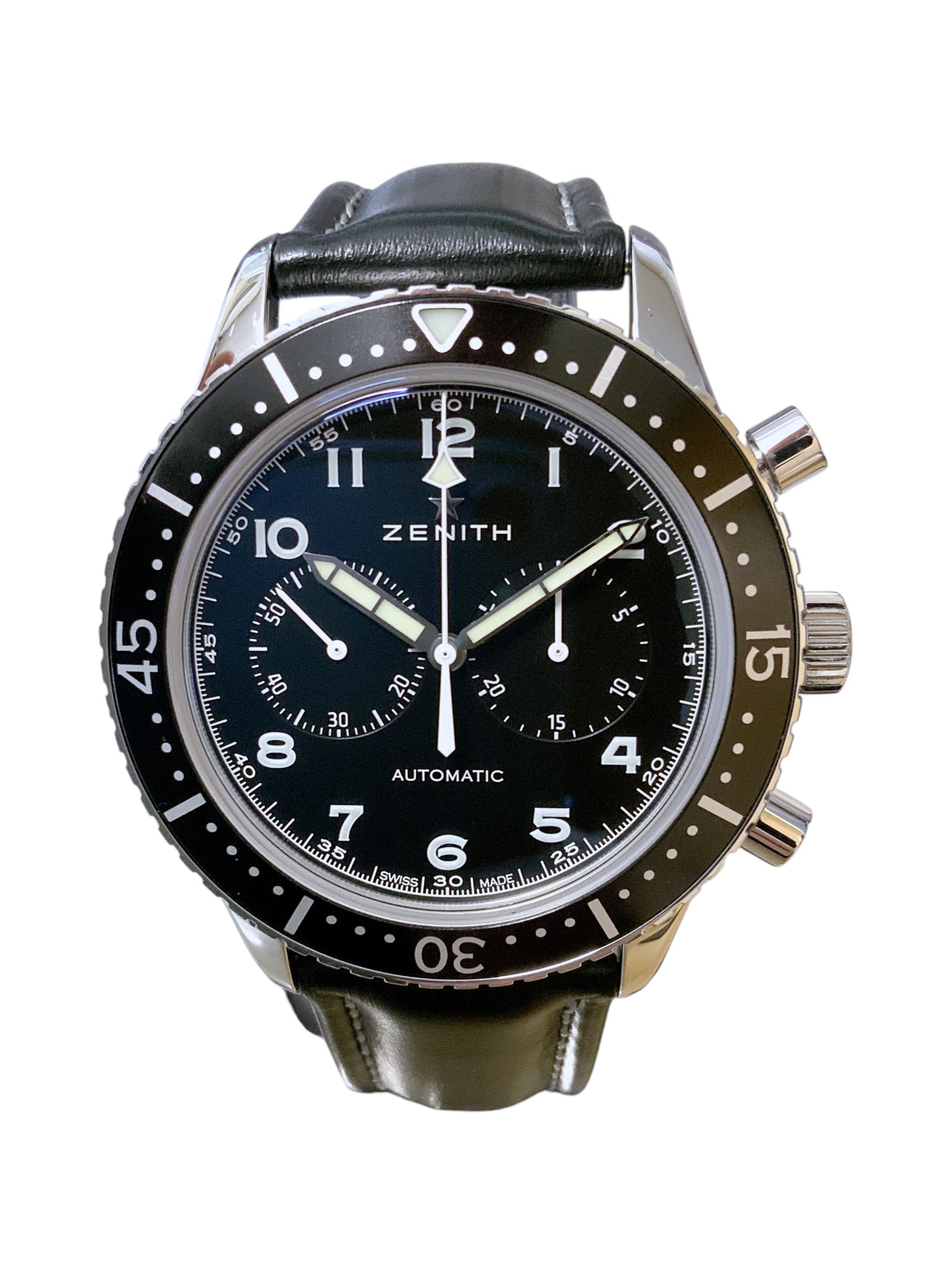 This Zenith Pilot 03.2240.4069/21.C774 has a black arabic dial and a leather strap. This Zenith has undergone a thorough inspection of water resistance, accuracy, functionality and condition to determine the level of reconditioning required to meet our strict standards. It has also been referenced against technical documents and manufacturer records where available to ensure authenticity and a clean history. All our watches have a 24-month warranty for your peace of mind.
